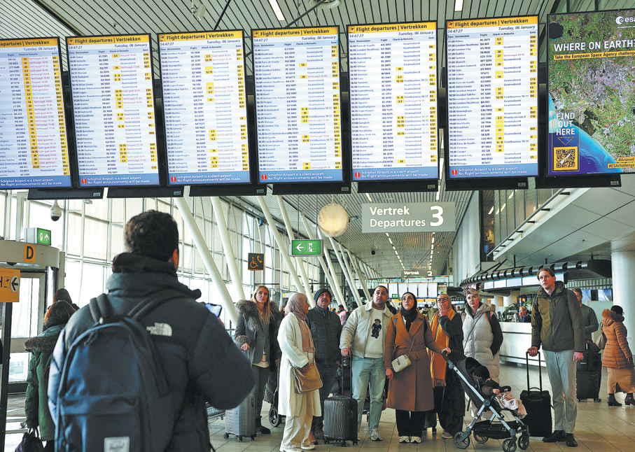 Passengers check departure boards at Amsterdam Airport Schiphol on Tuesday as snowfall disrupts air, rail and road travel across the Netherlands. Schiphol Airport, one of the largest in Europe, announced at least 700 flight cancellations on Wednesday because of snow and wind. PIROSCHKA VAN DE WOUW/REUTERS